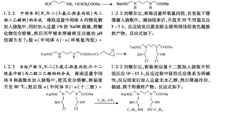 1,3-丙二胺與氯乙酸鈉反應(yīng)合成中間體A(N,N-丙二胺二乙酸鈉);中間體A與環(huán)氧氯丙烷反應(yīng)生成中間體B(N,N-二(3-氯-2-羥基丙烷)丙二胺二乙酸鈉);中間體B最后與十二胺反應(yīng)生成目標(biāo)產(chǎn)物,N,N-二(3-氯-2-羥基丙烷-N-十二烷基仲胺)丙二胺二乙酸鈉(簡稱GAC-312)。