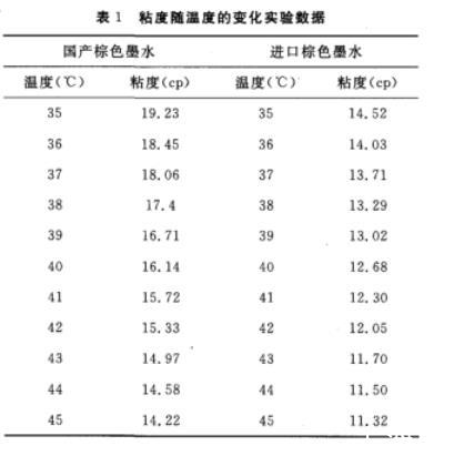 從圖1分析得出,陶瓷墨水的粘度隨著溫度的升高而呈現線性下降趨勢,噴墨生產為了減少環境變化對噴墨的影響,噴墨二級墨盒(即直接連接噴墨的墨水中轉裝置)的溫度一般在35~45℃范圍內調節,正常設置溫度為40℃。所以,如果生產中出現滴墨的情況,或者出現由于墨水粘度太高造成打印不流暢,可以通過調節溫度來調節墨水的粘度以及墨水的流動性。實驗結果表明,無論是進口墨水還是國產墨水,35℃比45℃時的墨水粘度一般都高3cp左右。實驗也說明國產墨水的流動性能可與進口墨水相媲美。
