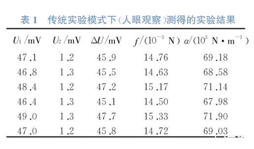 在用拉脫法測量液體表面張力系數實驗中,最關鍵實驗數據是記錄金屬環拉斷液柱前的瞬間數字電壓表讀數U1和拉斷液柱后的數字電壓表讀數U2;在實際的實驗過程中,學生需要一邊觀察金屬環與液體表面的連接情況,一邊又要觀察實驗儀器上顯示面板的數值變化,而金屬環與液面是瞬間脫離的,學生需要緊盯顯示面板觀察記錄電壓值的變化。由于“拉斷液柱”的過程變化太快,因此導致數字電壓表的數據變化也很快,僅依靠人眼睛觀察,很可能會來不及記錄數據的變化,或者記錄數據的時刻不夠準確,從而增加了讀取數據的偶然因素,導致實驗誤差過大[10-14]。此外,在這種模式下,學生對實驗過程中表面張力的變化趨勢(電壓值變化趨勢)并沒有直觀地了解,難以發現其變化規律,也不了解各個階段拉力的具體變化。