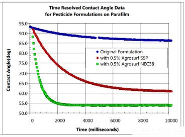 每種配方的初始接觸角大約為90°,原始配方平衡接觸角為86°,添加了Agrosurf SSP后的農(nóng)藥,平衡接觸角降到61°,而添加了Agrosurf NEC38后,接觸角降低更快,平衡后為54°。
