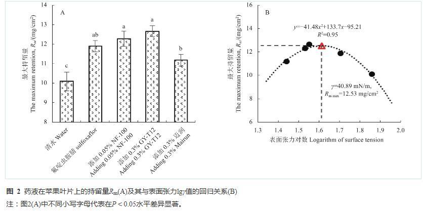 2.4添加助劑后藥液在蘋果葉片上最大持留量及與表面張力的關(guān)系