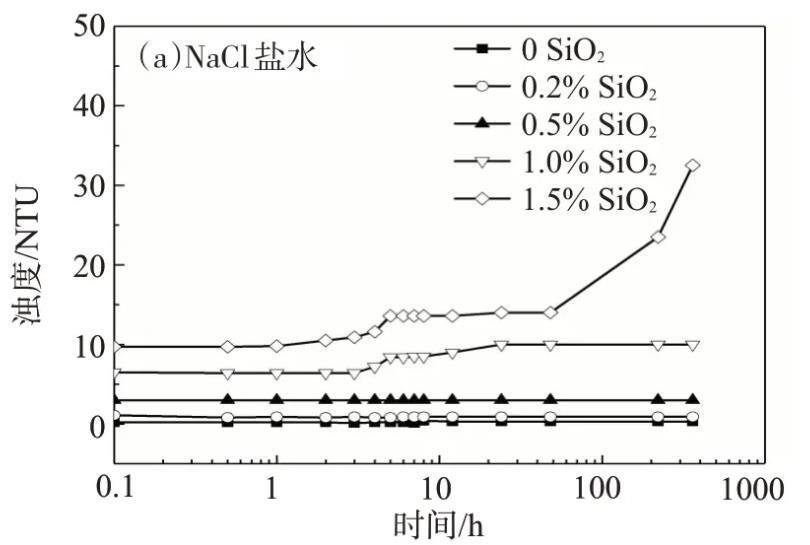 利用沉降法和濁度法分析分別用NaCl鹽水、模擬地層水配制的不同納米SiO2含量的納米SiO2/SDS體系的穩定性,濁度法測試結果如圖1所示。用NaCl鹽水配制的SiO2/SDS體系在靜置15 d時,僅納米SiO2質量分數為1.5%的體系出現了輕微的渾濁,而其它體系均保持澄清透明;當納米SiO2質量分數為1.5%時,SiO2/SDS體系的濁度隨靜置時間的延長稍有增大,其它體系的濁度幾乎不隨靜置時間的延長而變化,且均小于15 NTU。由此可見,用NaCl鹽水配制的納米SiO2/SDS體系的穩定性良好。
