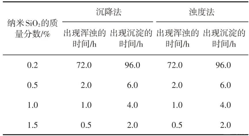 表1模擬地層水中納米SiO2/SDS體系出現渾濁、沉淀的時間(SDS質量分數為0.3%)