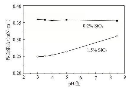 當(dāng)SiO2質(zhì)量分?jǐn)?shù)為1.5%時(shí),納米SiO2/SDS體系靜置不久納米SiO2即聚集在一起,使得SiO2與SDS之間的排斥作用減小,隨著pH值的降低,水化作用力及H+保護(hù)層的形成使得納米SiO2聚集的幾率大大降低,SiO2顆粒在體系中分散較均勻,因此SiO2與SDS之間的排斥作用增大,體系降低油水界面張力的能力增強(qiáng)。當(dāng)SiO2質(zhì)量分?jǐn)?shù)為0.2%時(shí),納米SiO2/SDS體系具有較好的穩(wěn)定性,pH值的下降對(duì)體系降低油水界面張力的能力基本無(wú)影響。