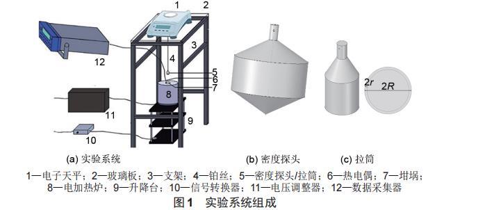 實驗系統(tǒng)由測量系統(tǒng)、加熱系統(tǒng)、控制系統(tǒng)和支撐系統(tǒng)組成。實驗系統(tǒng)如圖1(a)所示。測量系統(tǒng)由高精度電子天平(型號為METTLER TOLEDO ME104,精度為0.1 mg)、數(shù)據(jù)采集器(型號為key sight 34872 A)、熱電偶(K型)、探頭組成;加熱系統(tǒng)由電加熱爐和坩坩堝堝組成;控制系統(tǒng)由電壓調(diào)整器(型號為T6-1-4-060 DC)、智俊軟件組成;支撐系統(tǒng)由升降臺、鋼架、玻璃板組成。