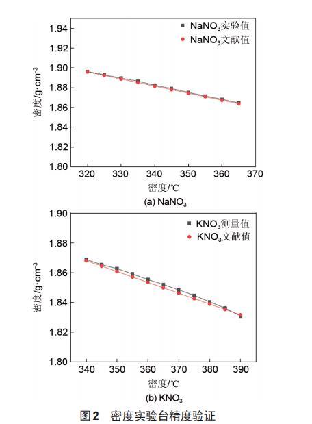 密度實(shí)驗(yàn)臺(tái)精度驗(yàn)證如圖2所示。密度實(shí)驗(yàn)臺(tái)測得NaNO_3、KNO_3的密度與參考文獻(xiàn)上給出的密度值變化趨于一致,并且最大偏差值低于0.12%,考慮到文獻(xiàn)值存在的誤差,本實(shí)驗(yàn)臺(tái)的密度測量精度滿足實(shí)驗(yàn)要求。