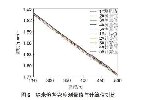 根據(jù)混合物密度計(jì)算公式對納米熔鹽的密度進(jìn)行計(jì)算后,與實(shí)驗(yàn)測量得到的密度進(jìn)行對比。
