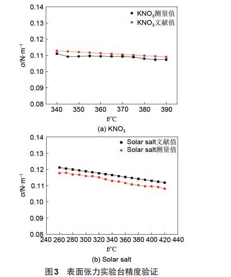 本實(shí)驗(yàn)先對NaNO3的表面張力進(jìn)行測量,得到儀器系數(shù)C。由式(4)可知,儀器系數(shù)C與溫度無關(guān),對NaNO3在5個(gè)溫度工況點(diǎn)下的表面張力進(jìn)行測量,并且每個(gè)溫度工況點(diǎn)采集3次測實(shí)驗(yàn)數(shù)據(jù),通過最終的計(jì)算得到本實(shí)驗(yàn)臺(tái)的儀器系數(shù)C=0.00053。對KNO和solar salt的表面張力進(jìn)行測量后,與文獻(xiàn)值進(jìn)行對比,如圖3所示。