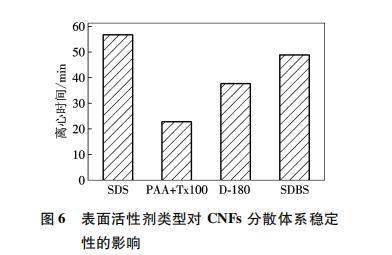 (1)UV-vis測試和Zeta電位測試結(jié)果表明,4種表面活性劑中,SDS對CNFs的分散性最好,SDBS次之,而D-180好于PAA復(fù)合Tx100.