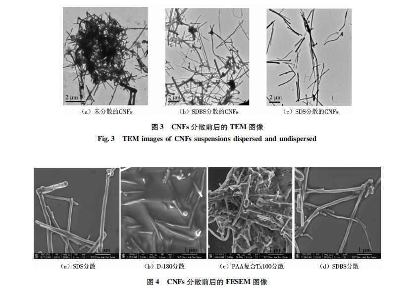 (2)TEM下觀察SDS與SDBS分散的CNFs懸浮液,可以看到CNFs纏結(jié)現(xiàn)象明顯得到改善,可觀察到單根CNF存在,SDS對CNFs的分散效果強于SDBS.
