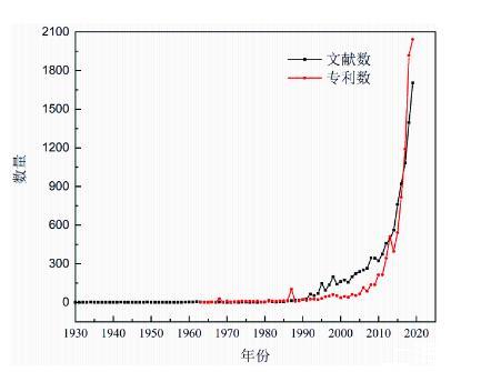 圖2氣凝膠論文與專利發(fā)表數(shù)量與年度趨勢圖,數(shù)據(jù)統(tǒng)計于web of science