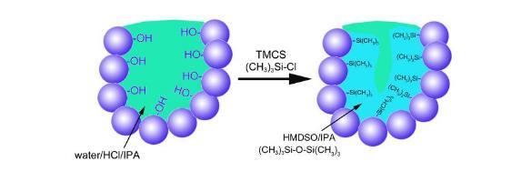 如圖6所示,采用三甲基氯硅烷(trimethyl chlorosilane,簡稱TMCS)對氧化硅凝膠孔壁表面進行疏水化處理,可實現(xiàn)常壓干燥制備氣凝膠。其中TMCS和異丙醇(isopropanol,簡稱IPA)分別作為疏水化試劑和溶劑。TMCS與靠近顆粒表面的孔反應(yīng),使孔壁表面的Si-OH轉(zhuǎn)化成硅甲基,有利于阻止水的吸附,形成孔表面疏水區(qū)域。同時,TMCS水解縮合生成六甲基二硅氧烷(hexamethyldisiloxane,簡稱HMDSO),且不與水混溶,隨著反應(yīng)的持續(xù)進行,水相逐漸從孔中排出,最終形成超疏水氣凝膠。