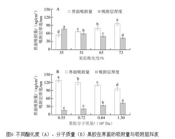 圖6不同酯化度(A)、分子質量(B)果膠在界面的吸附量與吸附層厚度