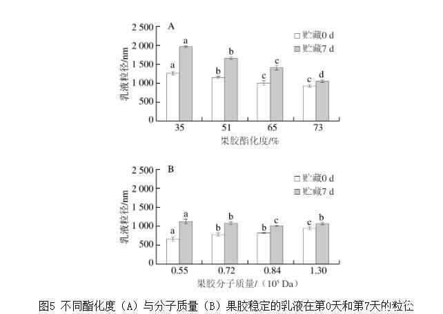 圖5不同酯化度(A)與分子質量(B)果膠穩定的乳液在第0天和第7天的粒徑