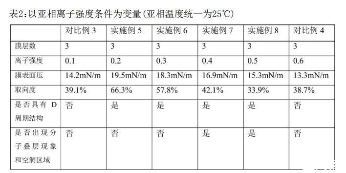 ?對比實驗:亞相溫度過高(>30°C)或離子強度過低(<0.2)會導致纖維排列混亂(對比例1–4),超純水亞相則無法形成D周期結構(對比例5)。