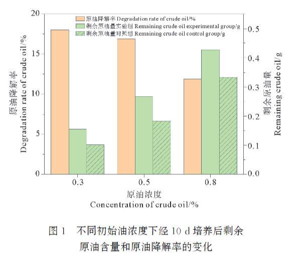 圖1不同初始油濃度下經10d培養后剩余原油含量和原油降解率的變化