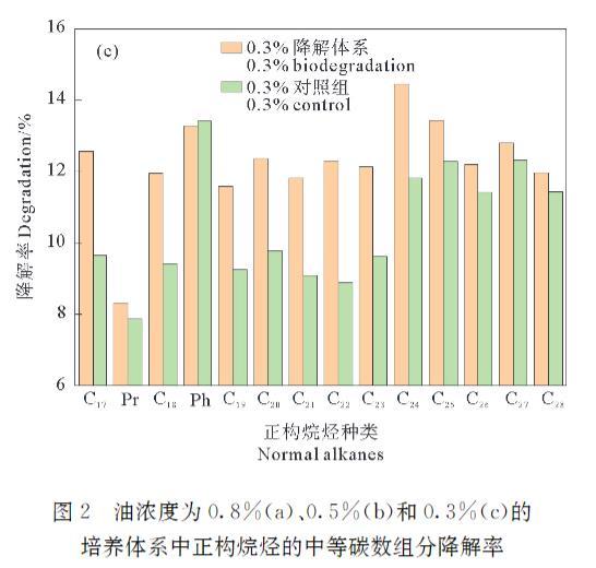 圖2油濃度為0.8%(a)、0.5%(b)和0.3%(c)的培養體系中正構烷烴的中等碳數組分降解率