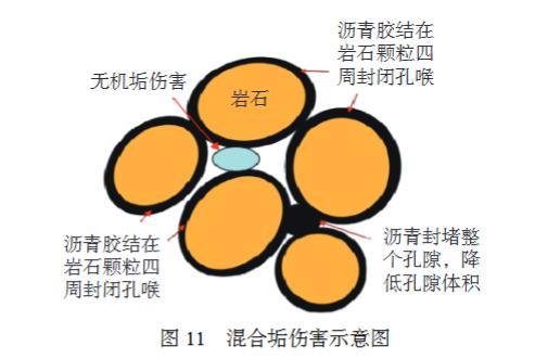 通過觀察傷害后巖心表面,可以發現瀝青在孔隙系統中的分布模式如圖11所示。對于孔隙系統來說,瀝青膠結在巖石顆粒四周,這類瀝青可能對減小孔隙體積作用不明顯,但其可以顯著限制或封閉孔喉,導致滲透率下降;另一種充填在孔隙內,堵塞整個孔隙,降低孔隙體積。儲層中的瀝青占據儲層的部分儲集空間,破壞儲層孔隙結構,不僅會減小儲層的孔隙度,同時還會大幅度減低儲層滲透率,嚴重影響儲層物性及油氣井產能。