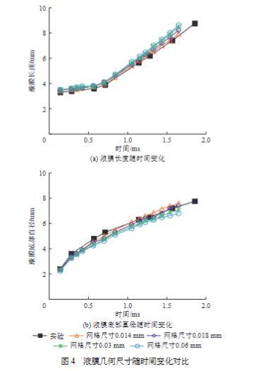 圖4液膜幾何尺寸隨時間變化對比