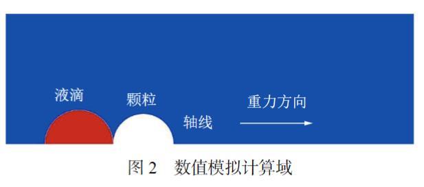 如圖2所示,液滴與顆粒對心碰撞時,流場在演變過程將始終保持軸對稱狀態,因此設置了二維軸對稱計算域。在相同的網格數量條件下,二維軸對稱計算域相較于三維計算域具有更好的網格質量和計算精度。在分析計算結果時,可以通過鏡像操作得到中軸線截面上的整體流場圖像。由于實驗中最大雷諾數的數量級為104,因此,依據PASANDIDEH-FARD等的研究結果,可認為在塵?霧碰撞過程中流場處于層流狀態。