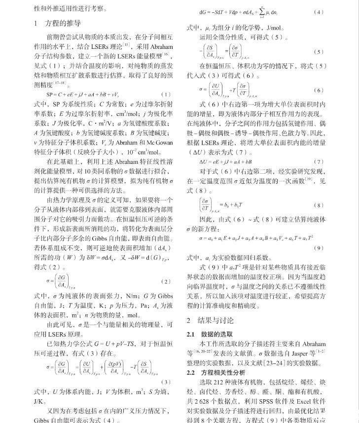 本工作提出一種將σ這一宏觀物性與微觀分子間作用力相關聯的一種新的計算方法。根據線性溶劑化能量關系(LSERs)理論和經驗方程,提出了在不同溫度下估算純有機物σ的關聯式。利用所得關聯式對2 628個純組分體系中的10個同系物進行了回歸,得到了σ的關聯方程,并對方程的相關性和外推適用性進行考察。