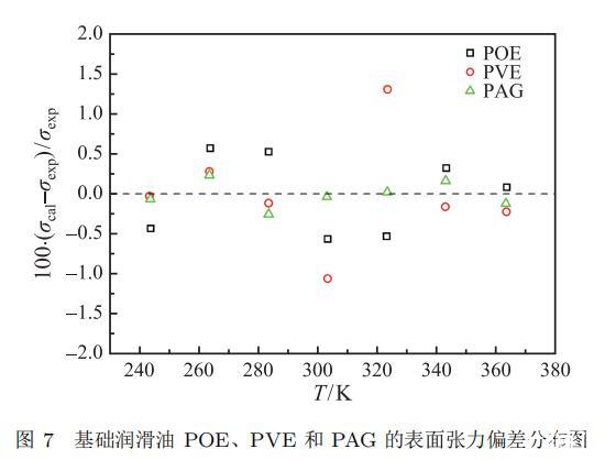 式中,T 是溫度,K;σ 是表面張力,mN·m?1;a、b 和 c 為關(guān)聯(lián)方程的擬合參數(shù)。基礎(chǔ)潤(rùn)滑油 POE、PVE 和 PAG 的參數(shù)關(guān)聯(lián)值和絕對(duì)平均偏差列于表 4 中,其實(shí)驗(yàn)數(shù)據(jù)與關(guān)聯(lián)方程的絕對(duì)平均偏差分別為 0.43%、0.45% 和 0.13%;三種基礎(chǔ)潤(rùn)滑油的相對(duì)偏差分布如圖 7 所示,其實(shí)驗(yàn)測(cè)量結(jié)果的相對(duì)偏差均在 ±1.5% 以?xún)?nèi),表明實(shí)驗(yàn)結(jié)果與關(guān)聯(lián)方程的吻合良好。