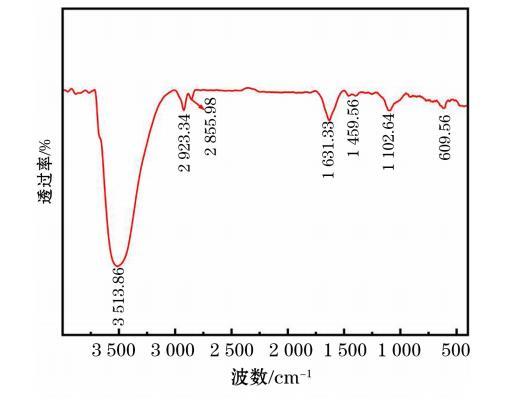 圖4顯示了YTDB的紅外光譜測試結果。由圖4可知,3513.86 cm?1處出現了一處弱寬峰,是N—H伸縮振動峰;2923.34 cm?1出現的弱峰以及2855.98 cm?1處出現的弱峰分別是—CH?—對稱伸縮振動峰以及非對稱伸縮振動峰;1631.33 cm?1處和1459.56 cm?1處出現的兩個峰,均為—NH?彎曲振動吸收峰;1102.64 cm?1處出現了一個弱寬峰,是C—N伸縮振動吸收峰。