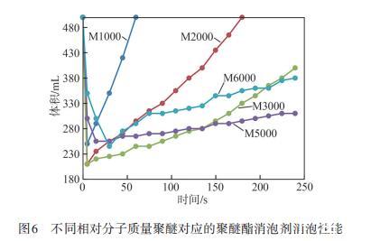 圖6不同相對分子質量聚醚對應的聚醚酯消泡劑消泡性能