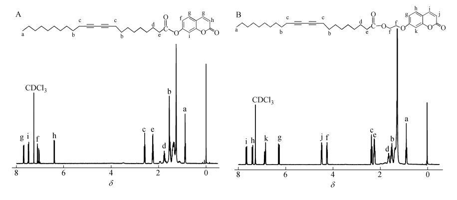 2類香豆素取代二乙炔單體參照文獻所述方法合成,分子結構及產物核磁譜圖如圖1所示。將2種產物分別溶于氯仿,配成1mg/mL的溶液。亞相為超純水(18.2MΩ·cm)。所有的π-A曲線和LB膜拉制實驗均為20℃條件下在KSV Mini-trough LB膜儀上進行。溶劑充分揮發后,膜障以5 mm/min的速率對其壓縮,在20℃和恒定膜壓35 mN/m下以2mm/min速率沉積Y-型LB膜。基片為石英片。薄膜的聚合是在16W的紫外燈(波長254nm)輻照下完成的,薄膜表面距離燈管下緣10cm,輻照時間5min。