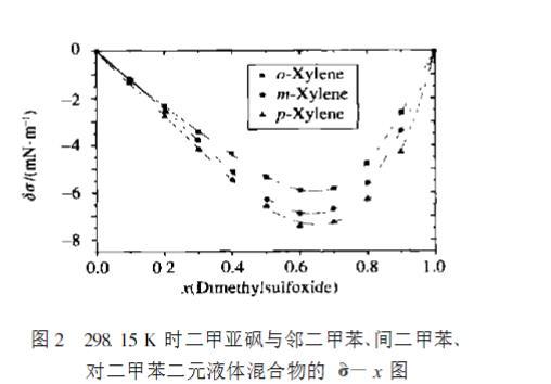 [圖2 298.15 K 時(shí)二甲亞砜與鄰二甲苯、間二甲苯、對(duì)二甲苯二元液體混合物的 δσ-x 圖]