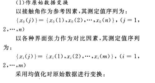灰色關(guān)聯(lián)分析是通過(guò)對(duì)統(tǒng)計(jì)序列幾何關(guān)系的比較來(lái)分清系統(tǒng)中多因素間的關(guān)聯(lián)程度,序列曲線的幾何形態(tài)越接近,則它們之間的關(guān)聯(lián)度越大。油水、水固、油固界面張力對(duì)接觸角影響程度的灰色關(guān)聯(lián)分析步驟如下。
