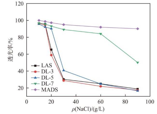 在許多工業應用中,水中含有大量的鹽類,例如在石油天然氣開采、海洋設備清洗或污水處理等場景中[2,7]。耐鹽型表面活性劑能夠保持在高鹽環境下的化學穩定性,避免沉淀或失效,確保其清洗能力不受影響,因此探究表面活性劑的耐鹽性有重要意義。圖3給出了LAS、DL-n、MADS的耐鹽性透光率圖,可以看出,LAS的耐鹽性最差,20 g/L NaCl時溶液渾濁,而MADS的耐鹽性最好,隨著混合磺酸鹽中MADS含量的增加,混合磺酸鹽的耐鹽性呈升高趨勢,說明MADS含量的提高有利于提高耐鹽性,這可能是由于無機鹽對陰離子表面活性劑的作用體現在離子頭基水化層的破壞作用,MADS分子中的雙磺酸結構電荷密度大,屏蔽了NaCl的作用。