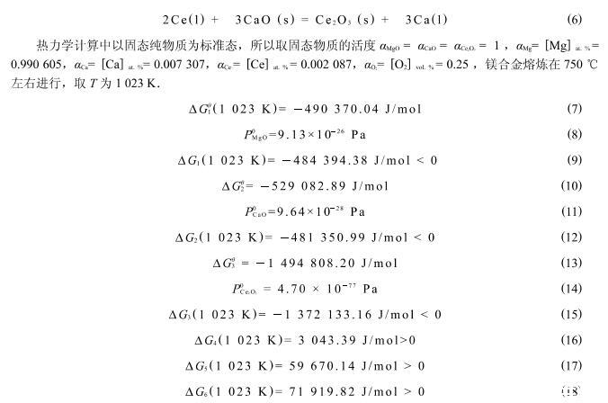 但由于Ce元素在合金熔體中是分布不均勻的,如圖6所示的點能譜分析可以看出,Ca和Ce在此處的相對原子分數分別達到了2.50%和3.34%.按照此處的原子活度計算得到:Delta G_4(1023~K)=-12885.19~kJ/mol<0,Delta G_5(1023~K)=17418.58~kJ/mol>0,Delta G_6(1023~K)=56138.14~kJ/mol>0,在此處式(4)中的反應可以自發地進行.由此可知,式(4)、(5)、(6)的反應在局部元素分布不均勻的區域有可能發生置換反應.