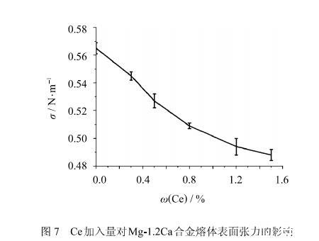 本研究測量了不同Ce含量對Mg-1.2Ca鎂合金熔體表面張力的影響.熔體表面張力的測量在730℃、大氣壓下進行,采用最大氣泡壓力法.其測試結果如圖7所示,可以看出隨著Ce含量的增加,Mg-1.2Ca-xCe熔體表面張力不斷下降.這與Ce含量在鎂合金熔體表面富集,提高熔體表面表面活性有直接關系.