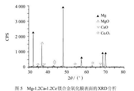 4)通過氧化膜的截面檢測和熱力學計算分析得出Mg-1.2Ca-1.2Ce的形成的氧化膜大致分為3層:外層是MgO,中間層是CaO,內層是Ce2O3。