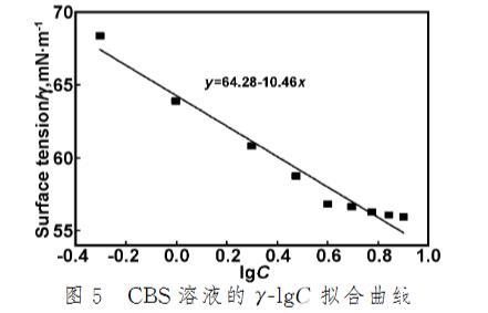 通過γ-lg C曲線,應用Gibbs吸附(式(1))可求出不同濃度下CBS溶液的表面吸附量。當CBS的表面張力與其濃度對數呈線性關系時,由直線的斜率即可求出飽和吸附量(rm)。圖5即為CBS溶液在20℃時的γ-lg C線性擬合。