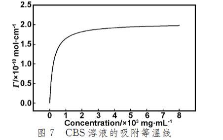 從圖7可以看出,CBS溶液在低濃度時吸附量隨濃度的增加而呈線性增長,增長速率非常快。隨后增長速率降低并趨向穩定,平穩后的飽和吸附量為1.97×10^-10 mol/cm^2,與之前的計算結果(1.86×10^-10 mol/cm^2)相似,相應的表面張力也為最低值。