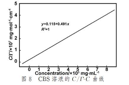 式(2)中,r為Gibbs吸附量,rm為飽和吸附量,C為溶質濃度,k為吸附常數。以C/r對C作圖應得到一條直線,其斜率倒數即為飽和吸附量rm。圖8即為CBS溶液的C/r-C圖。從圖8可以計算出CBS溶液的飽和吸附量為2.03×10^-10 mol/cm^2,這與γ-lg C和r-C兩種曲線擬合的結果基本相等。