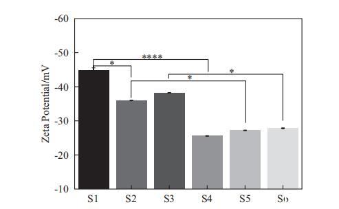 在我們的研究中,測量了Zeta電位,如圖6所示。對于SLES體系(S1-S3),S1表現出最負的Zeta電位,其次是S3,而S2的Zeta電位最小。對于SMCT體系(S4-S6),它們之間的Zeta電位沒有顯著差異。比較SLES和SMCT體系時,可以觀察到SMCT體系的Zeta電位低于SLES體系。此外,在S1和S4、S2和S5以及S3和S6之間發現了顯著差異。