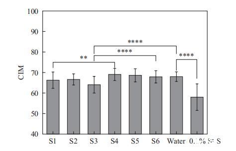 這里我們使用這種方法評估了6種表面活性劑復合物的溫和性。如圖5所示,SMCT體系(S4-S6)的CIM值與水的CIM值相當,并且顯著高于SLES體系(S1-S3)。這表明SMCT體系表現出優異的溫和性,對皮膚脂質屏障的破壞潛力低于SLES體系。對于SLES體系,引入非離子表面活性劑導致S2(含APG)的CIM略有變化,但S3(含海藻糖脂)的CIM顯著降低。類似地,對于SMCT體系,加入APG(S5)和海藻糖脂(S6)后,CIM值顯著低于S4。這表明加入海藻糖脂對兩種體系的溫和性都有影響,意味著皮膚脂質提取能力增強。然而,這一結果與上述體外細胞測試中IL-1a測試的結果相矛盾。這種差異可能是由于兩種方法的作用機制不同。角質層表面測量法主要反映表面活性劑對皮膚脂質屏障的破壞,而細胞測試中的IL-1a與細胞反應相關。但細胞不像皮膚那樣擁有脂質屏障。