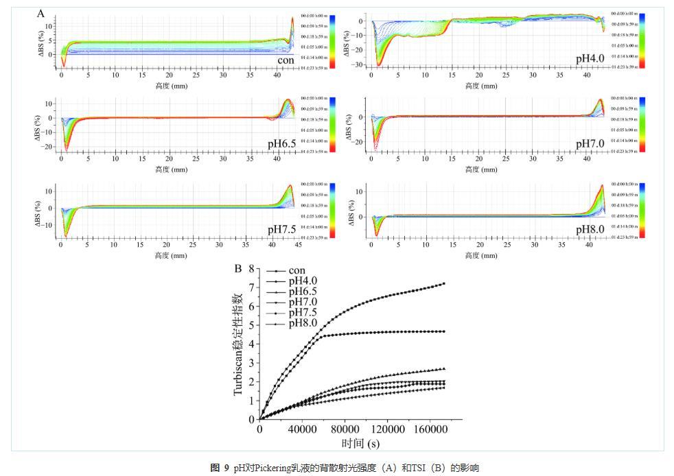 雖然BS可以直觀反映乳液體系的局部不穩定現象,但無法量化比較多個樣品的不穩定程度。因此乳液穩定性也可以使用TSI值來表征。TSI可以表征多種不穩定現象對光強度變化的綜合影響,還可以比較出不同樣品間的穩定性差異;TSI值越大,乳液體系越不穩定。不同pH制備的PPP-NP穩定的Pickering乳液的TSI如圖9B所示。所有樣品的TSI值均隨著掃描時間的增加而增大。從圖9B可以看出,乳液穩定性結果為pH8.0>pH7.5>pH7.0>pH6.5>pH4.0>con。這與圖7的儲藏穩定性直觀圖相一致。在瓶裝直觀圖中,肉眼僅方便觀察并記錄由乳液液滴上升引起的乳液分層,然而,在TSI測量中,TSI值不僅記錄了分層現象,而且還記錄了絮凝和聚結。絮凝和聚結被認為是乳液穩定性中影響因素的一部分。因此TSI值的變化能更全面、系統的表征乳狀液體系的穩定性。