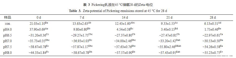 由圖8可知,當儲藏14 d時,Con、pH4.0的乳液均出現大面積的油滴聚集,pH6.5的乳液出現局部小聚集,而pH7.0~8.0的乳液微觀結構顯示其分布仍然均勻,無任何油滴聚集現象。當儲藏28 d后,Con、pH4.0、pH6.5的乳液中聚集程度明顯加強,pH7.0的乳液也有較微弱的局部小聚集現象;而pH7.5與pH8.0的乳液仍保持良好的分布狀態,這與圖7的視覺直觀圖、表2粒徑監測和表3電位監測的結果保持一致。CLSM的結果再次證實PPP-NP穩定的乳液酸性條件下的長期穩定性較差,在中性和堿性條件下有著更好的乳液穩定性。這一結果與He等的結果相似,其所制備的樣品同樣在堿性條件下穩定性更高。