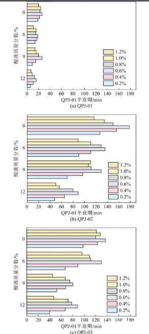 為了研究3種不同濃度起泡劑復配不同濃度酸溶液的泡沫穩定性能,根據泡沫持續時間(半衰期)評價泡沫體系的穩定性,如圖8所示。由圖8可知,不同起泡劑復配體系的半衰期存在顯著差異,其中QPJ-01復配溶液的泡沫半衰期明顯低于其余2種,QPJ-02泡沫半衰期更長,泡沫體系穩定性更好。同時,酸液濃度對泡沫穩定性起抑制作用,酸液濃度越高,泡沫衰減速度更快,清水復配3種起泡劑溶液泡沫半衰期均更長。