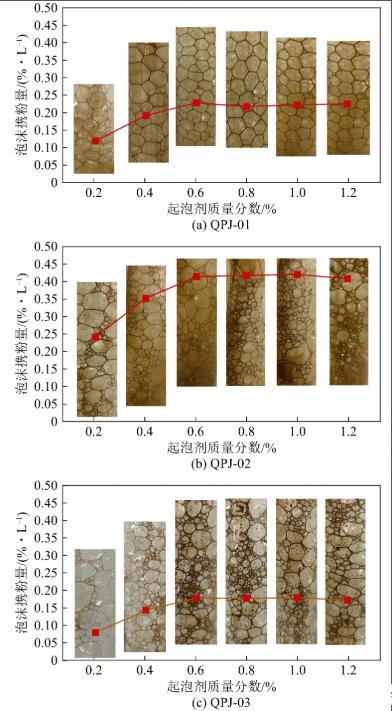 在臨界濃度范圍內的QPJ-01濃度越高,泡徑差別越小,泡徑逐漸均勻,導致起泡劑質量分數小于0.6%時攜粉量隨起泡劑濃度緩慢增長。QPJ-01氣泡體系整體泡徑大,然而泡徑越大氣泡穩定性越差,這是QPJ-01泡沫穩定性最差、半衰期最短的原因,也是造成QPJ-01單位體積泡沫攜粉量較少的原因。