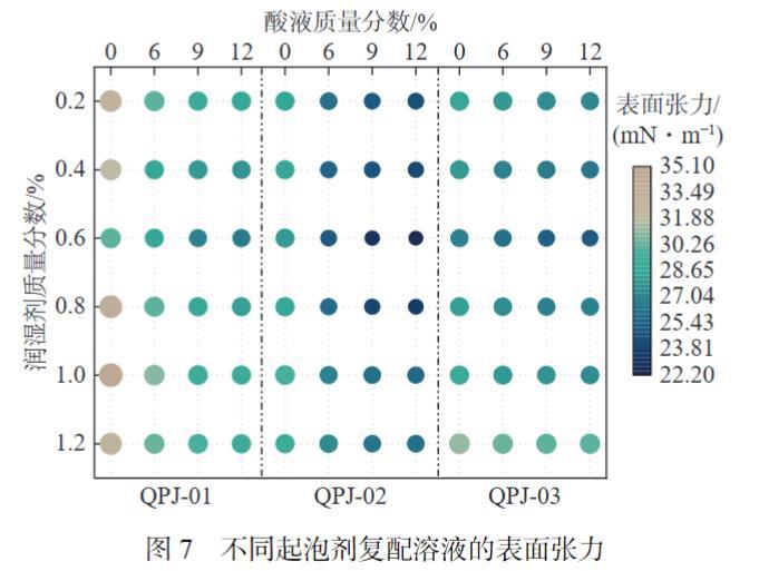 氣液界面表面張力一定程度上表征起泡性能,溶液氣液表面張力越小,分子間束縛力下降,氣泡更容易溢出,起泡性能更強。因此為了測定混合酸環境下不同起泡劑復配溶液起泡效果,選用設備為SDC-350整體傾斜型接觸角測量儀開展表面張力測試試驗。圖7為QPJ-01、QPJ-02、QPJ-03等3種不同濃度起泡劑在清水與不同濃度酸液條件下的氣液界面表面張力,由圖7可知,3種起泡劑?酸液復配溶液表面張力與起泡劑?清水溶液相比,均呈降低狀態,溶液含酸較清水會顯著降低氣液界面表面張力,含酸率越高,表面張力越小,在一定程度上溶液酸度對起泡性能起促進作用。在相同起泡劑復配酸液溶液內,酸液濃度越大,氣液界面表面張力減少越緩慢,酸液越稀,表面張力下降越快。