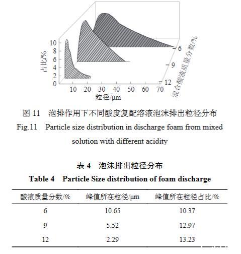 結(jié)合泡排作用下泡沫酸起泡效果與泡沫酸潤濕攜帶效果,優(yōu)選出QPJ-02酸液為效果最好的泡排復(fù)配溶液。圖11為QPJ-02質(zhì)量分?jǐn)?shù)為0.6%時,復(fù)配不同濃度酸液后泡沫排出粒徑分布。由圖11可知,酸液濃度越高,泡排作用下排出無機(jī)礦物粒徑越小,粒徑范圍越小。當(dāng)混合酸液質(zhì)量分?jǐn)?shù)為6%時,無機(jī)礦物排出粒徑最高為10.65μm,約為酸液質(zhì)量分?jǐn)?shù)為12%時無機(jī)礦物排出粒徑的4.65倍,為酸液質(zhì)量分?jǐn)?shù)為9%時無機(jī)礦物排出粒徑的2.41倍。這是由于酸液對無機(jī)礦物表面的刻蝕削減作用,而無機(jī)礦物粒徑越小,越易被泡沫攜帶出煤層氣井,因此注氣泡排作用下結(jié)合泡沫酸的潤濕攜帶效果與酸液的溶蝕效果對于低產(chǎn)煤層氣井無機(jī)礦物的解堵增滲是十分重要的。