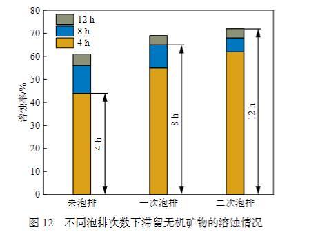 圖12為QPJ-02復(fù)配酸液在質(zhì)量分?jǐn)?shù)為12%、起泡劑質(zhì)量分?jǐn)?shù)為0.6%時,不同循環(huán)間歇泡排次數(shù)下井筒內(nèi)滯留無機(jī)礦物的溶蝕情況。由圖12可知,當(dāng)起泡劑-酸液未經(jīng)過泡排,酸浸12 h后無機(jī)礦物的溶蝕率僅為60.7%,經(jīng)過1次泡排12 h后無機(jī)礦物的溶蝕率為69.1%,經(jīng)過2次泡排12 h后無機(jī)礦物的溶蝕率為72.3%。隨著泡排次數(shù)的增加,無機(jī)礦物溶蝕率逐漸增長,這是由于經(jīng)過泡排作用的氣泡吞吐過程中,酸液與無機(jī)礦物表面作用更加充分,使得泡排作用對溶蝕率起促進(jìn)效果。