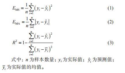 按照 8: 2的比例將實驗數據劃分為訓練集和測試集,對每個模型進行訓練,并在測試集上進行驗證。這里選用 3種常用于回歸任務的評價指標:均方誤差(MSE)、平均絕對誤差(MAE)和決定系數 R2。 MSE和 MAE可以衡量預測值與真實值之間的誤差,數值越小表示模型預測的越準確; R2 度量模型擬合數據的程度,取值范圍在 0到 1之間,越接近 1表示模型對數據的擬合程度越好。這 3個評價指標的計算公式如下所示: