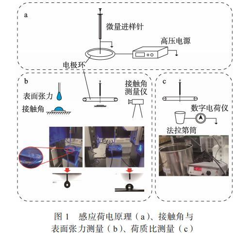 圖1 感應荷電原理(a)、接觸角與表面張力測量(b)、荷質比測量(c)