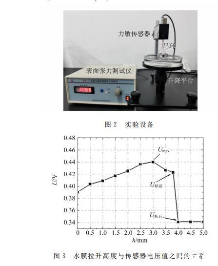 圖2是WBM-1A拉脫法液體表面張力實驗儀,用來測定純凈水的表面張力系數(shù)。實驗時采用標(biāo)準吊環(huán)的內(nèi)、外徑分別為d1=33.10 mm,d2=34.96 mm,平均直徑為d?=34.03 mm,平均周長為πd?=106.88 mm。該標(biāo)準環(huán)拉出的水膜高度與力敏傳感器電壓讀數(shù)之間的關(guān)系,如圖3所示。可以看出,隨著水膜高度的增加,吊環(huán)拉力逐漸增加到最大(圖中Umax表示),然后慢慢減小,直至水膜斷裂。圖中U斷前和U斷后分別表示水膜斷裂時和斷裂后的瞬時電壓值。吊環(huán)的受力變化情況與之前理論分析一致。